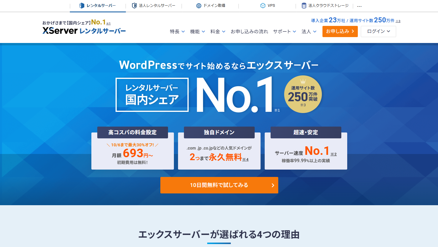 ※WordPressクイックスタートは「10日間の無料お試し」に対応していません。