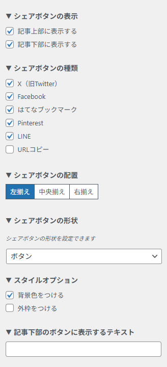 | シェアボタンの表示 | 「記事上部」「記事下部」の表示・非表示を設定できます。 |